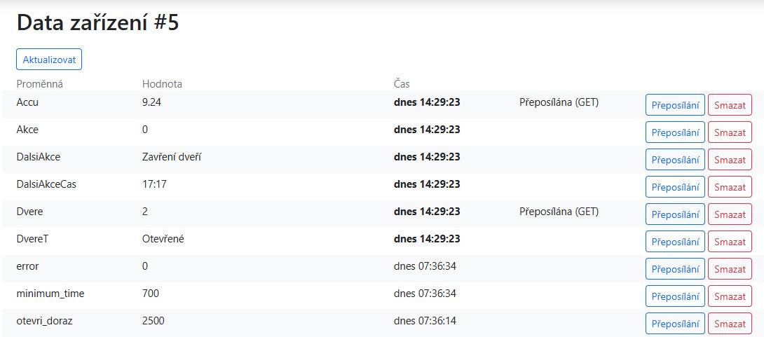 Zde je vidět část proměnných, které zasílá náš chytrý kurník.