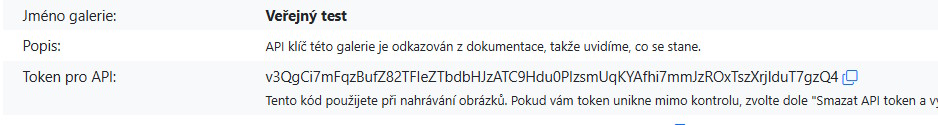 V detailu galerie je položka Token pro API. Kód, který je v ní uveden, je potřeba pro posílání obrázků na server pomocí API.