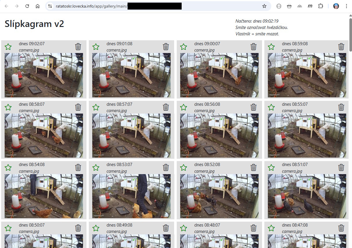 Po otevření adresy galerie se ukáže seznam obrázků. Pokud je přihlášený vlastník, má u každého možnost mazání (ikona koše). Ikonou hvězdičky je možné označit fotku pro výběr nejlepších nebo označení odebrat.